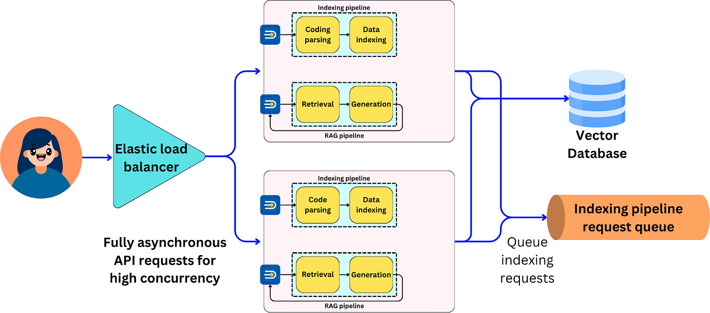 With this course, I want to focus on what we would need to do to deploy the application to 1M users. We will make sure to design every endpoint to be asynchronous, queue the indexing requests, and deploy the application with elastic load balancing to scale the application horizontally.
