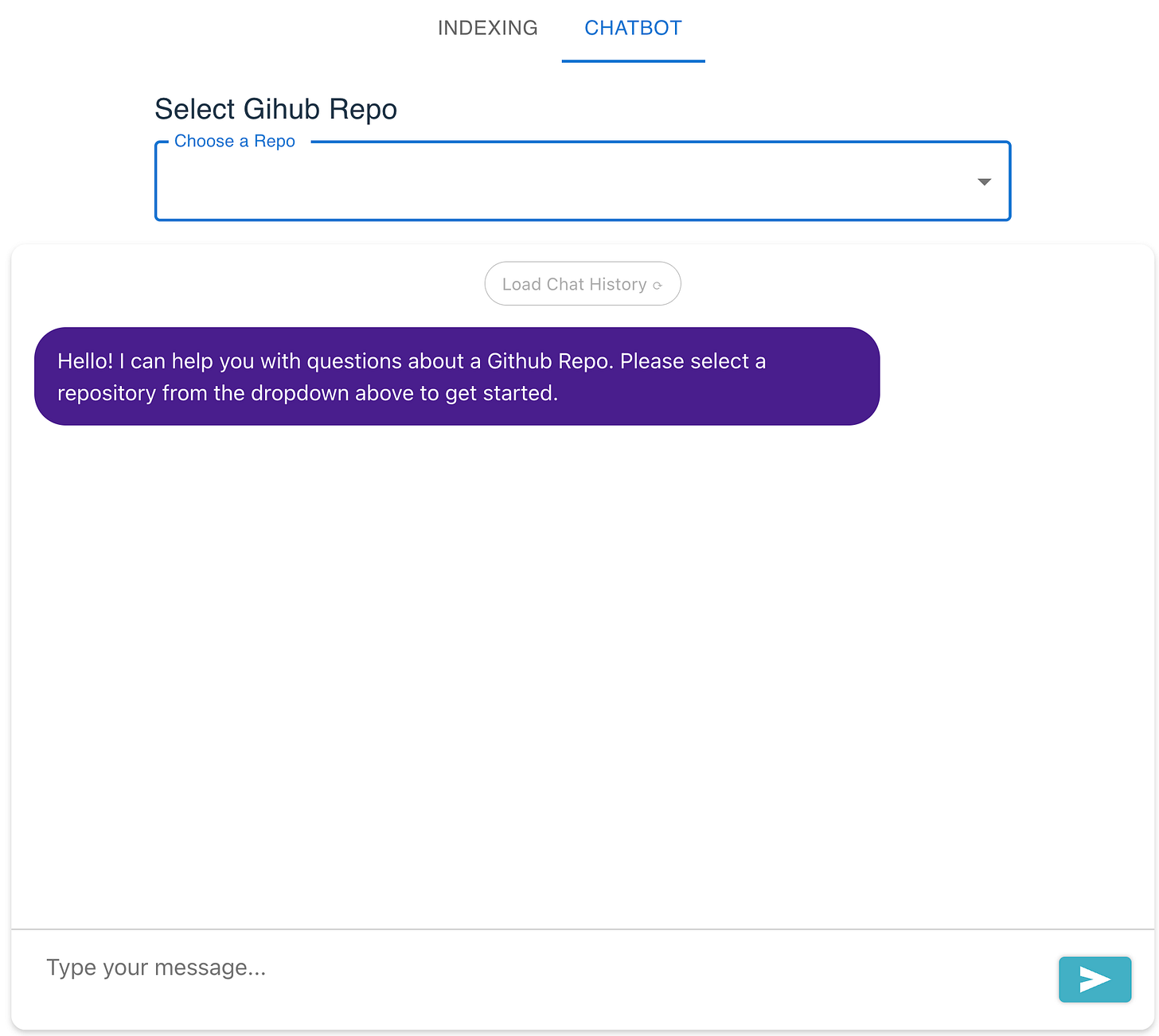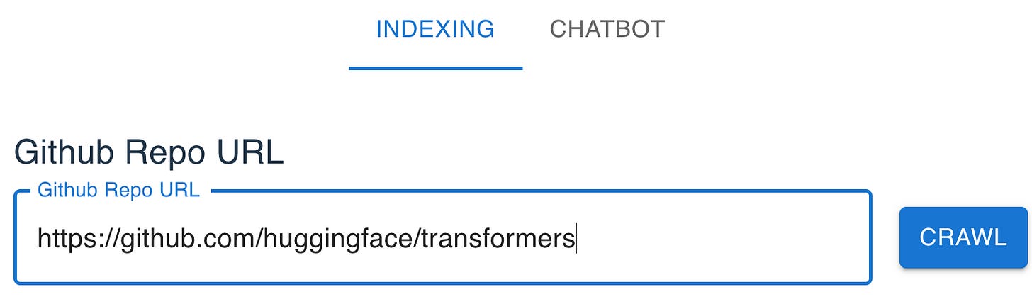A page where we can input the repository URL and start the crawling and indexing processes: