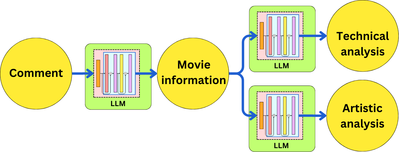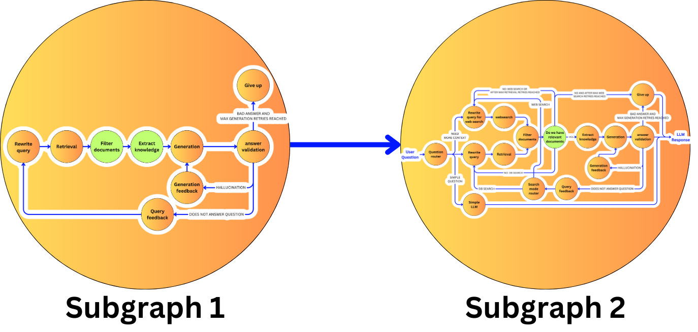 If we need to solve complex problems, then we need to include more of those simple agents, and the complexity will be offloaded on the human-designed architecture and the software needed to orchestrate the interactions. We often dismiss LLM pipelines as "Open API wrappers", but we underestimate the value of the domain expertise needed to build those wrappers to solve problems in a niche domain. For example, the previous graph could be part of a larger application as a subgraph.