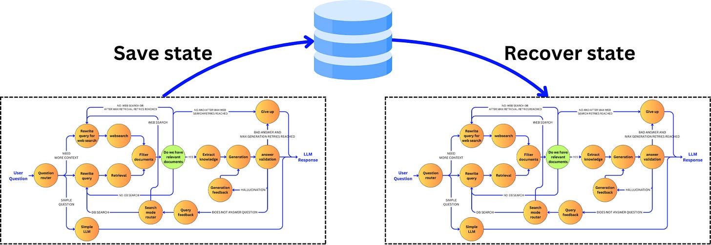 In cases where hallucinations are more likely to occur or when decisions should not be taken automatically, then it is important to implement software with humans in the loop to validate the intermediary outputs. This allows humans to provide feedback to an autonomous system and brings the system back on track if it starts to diverge from what is expected. For example, in the previous supervisor application, let’s induce human feedback: