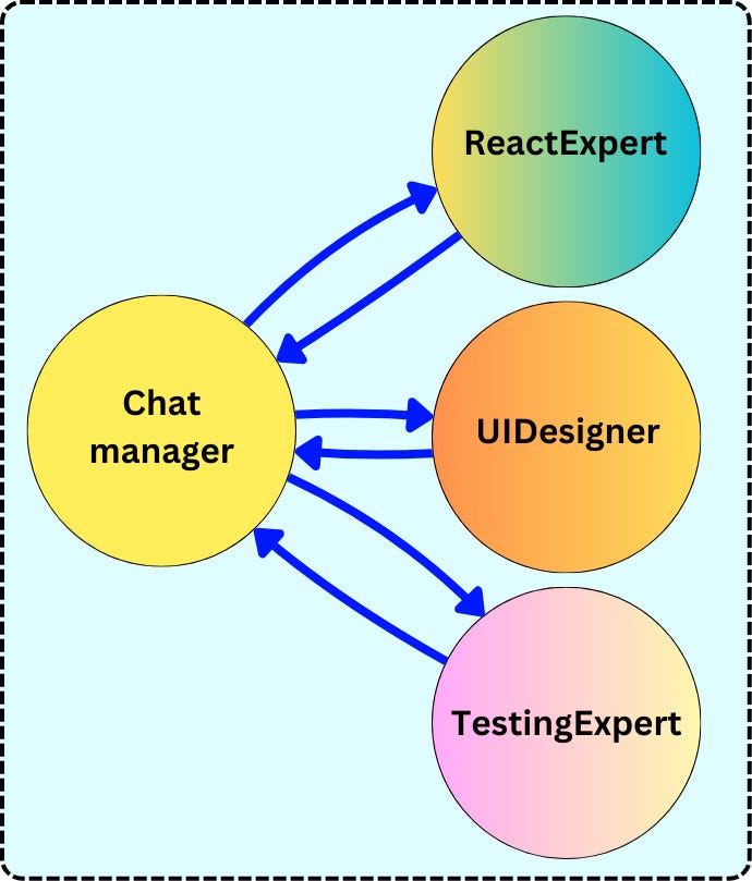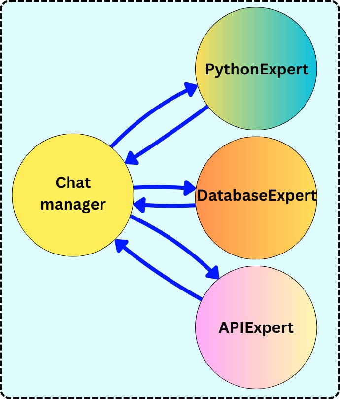 In Autogen, the way we define “agents“ and how they interact is a bit different. The decision engine and the tool executor are separated into different agents, and instead of iterating on the same agent, we have two agents having a “conversation“:
