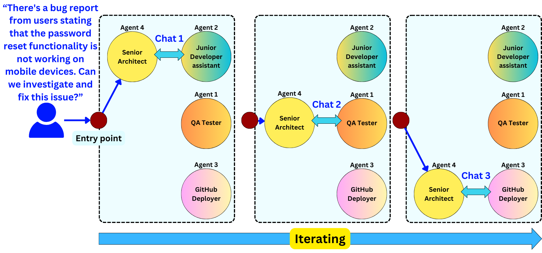 )This agent will take the user's message and send it to another agent. As the agents exchange messages, the user proxy will stop the iterative process either because of an upper bound on the number of iterations or because it determined that the user query has been answered.
