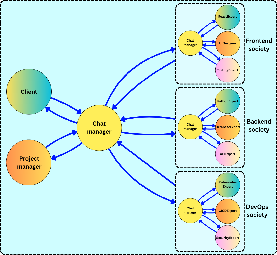 To scale the complexity, we introduce more agents exchanging messages in a structured manner. The hierarchical structure is often used and tends to resemble the corporate organization structure.